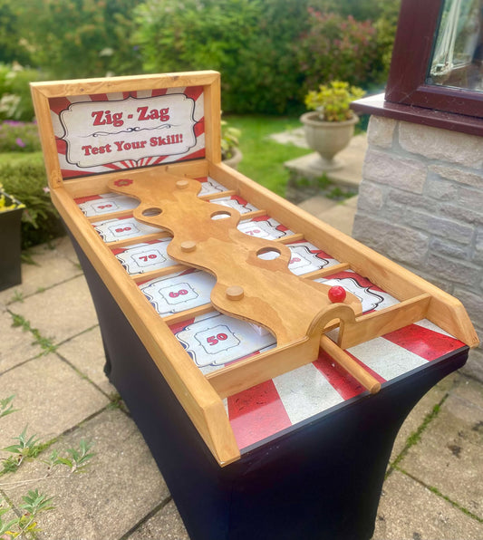 All of the free-standing games are around 4ft tall by 2ft wide and fold flat for easy transport in a car or small van. The table games are 4ft long by 2ft wide. The average weight is around 10kgs per game so no heavy lifting.
