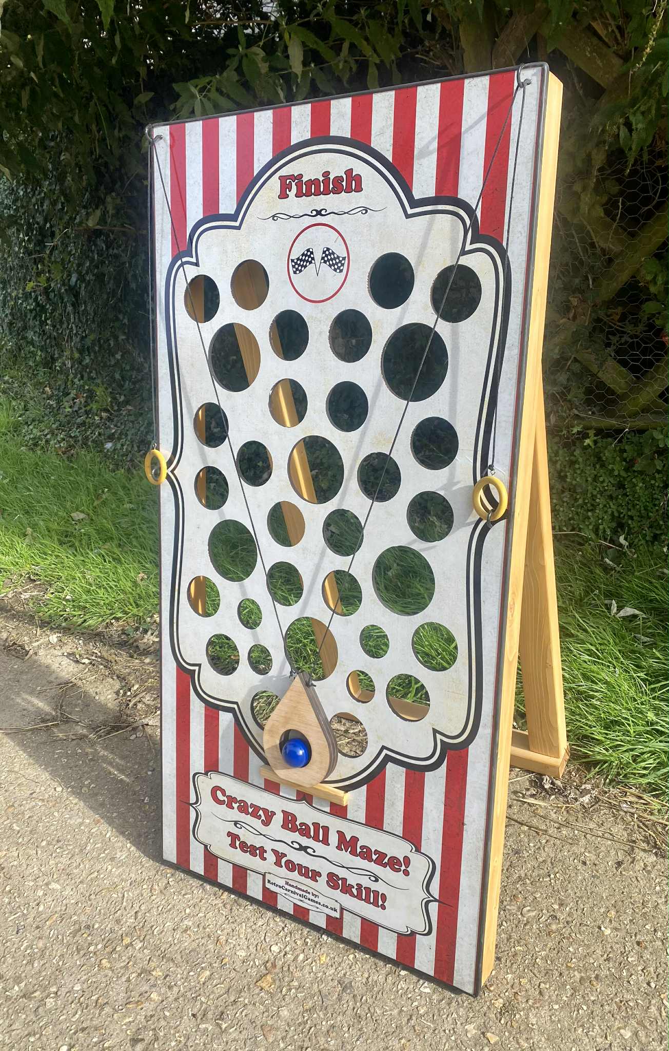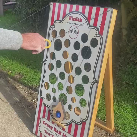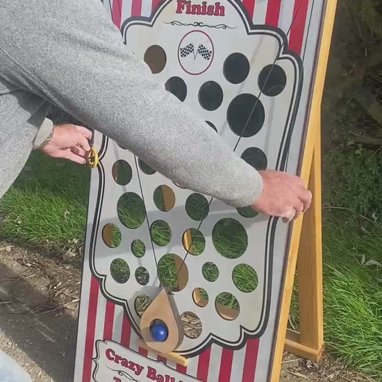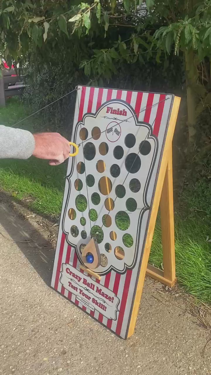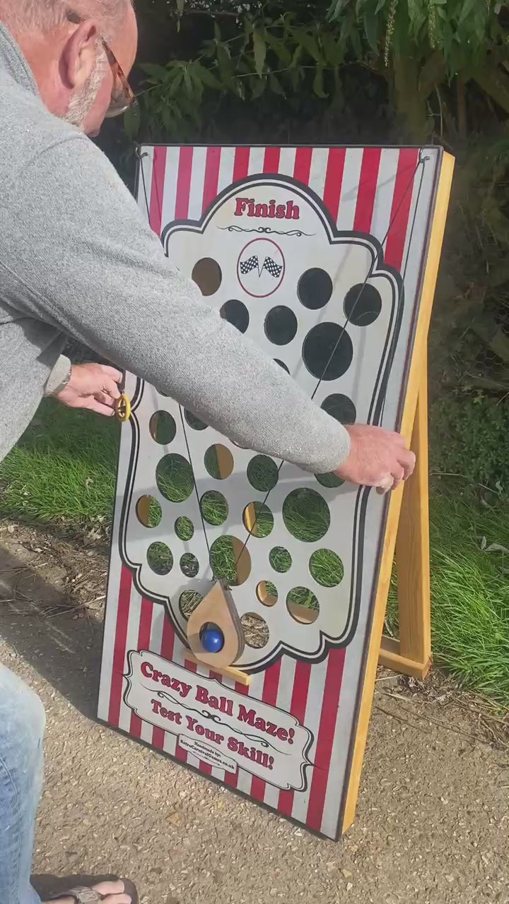 Crazy Ball Maze is a great carnival attraction and fete game. Players need to navigate the ball through the maze from the bottom to the top using the two pulleys trying not to let it fall through the holes. Very addictive and so much harder than it looks! It is handmade in wood, stands 4ft tall and has folding rear supports to make it very stable. It comes with all accessories. Available in the standard red striped retro graphics, included in the price or maybe add your company name/logo, website or have it fully branded in your company colours!