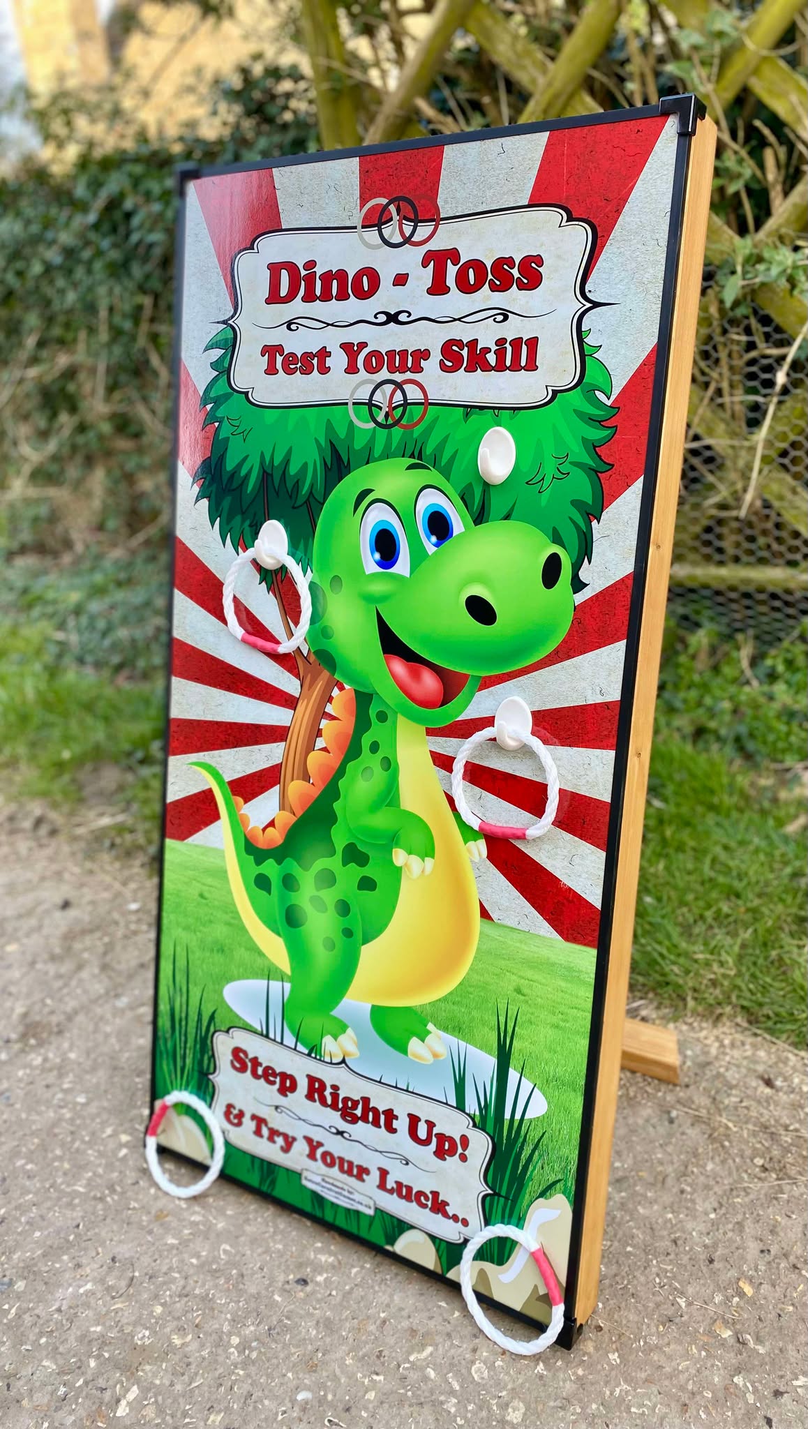 Dino-Toss is a colourful fun retro carnival attraction and fete game and will be loved by everyone. It is handmade in wood, stands 4ft tall and has a rear support to make it very stable. It comes with all accessories to play the game. Available in the standard red striped retro graphics, included in the price or maybe add your company name/logo, website or have it fully branded in your company colours!