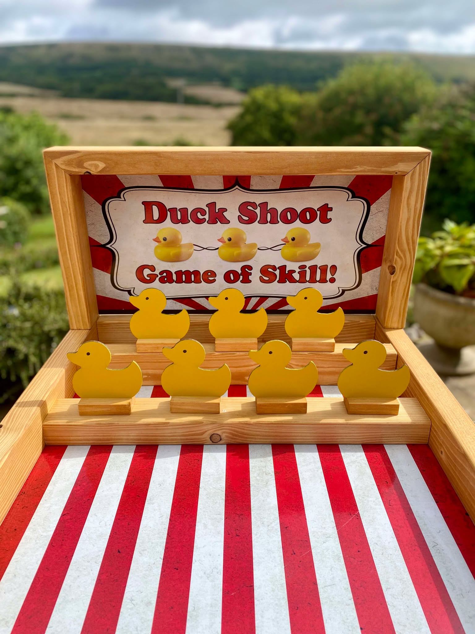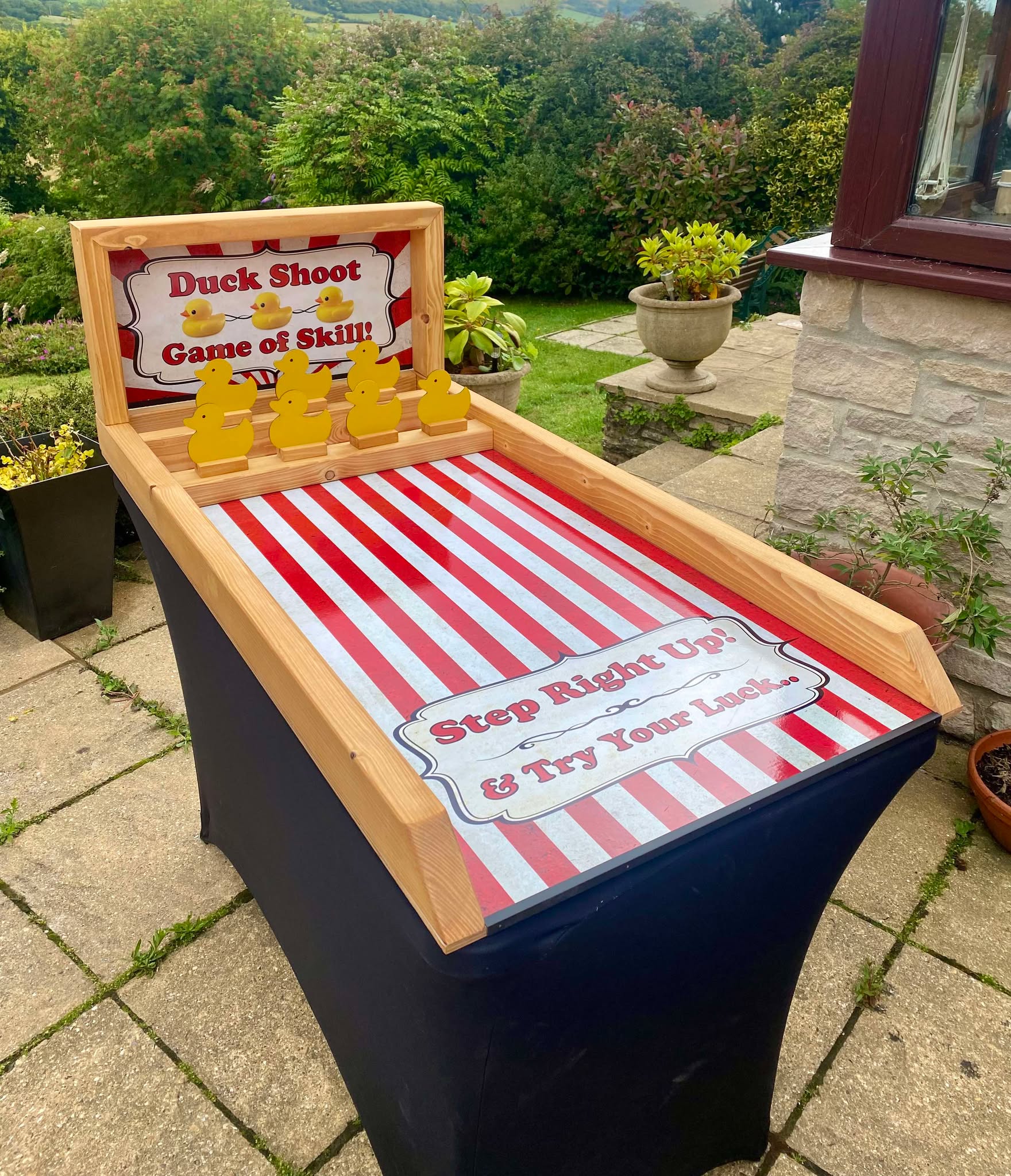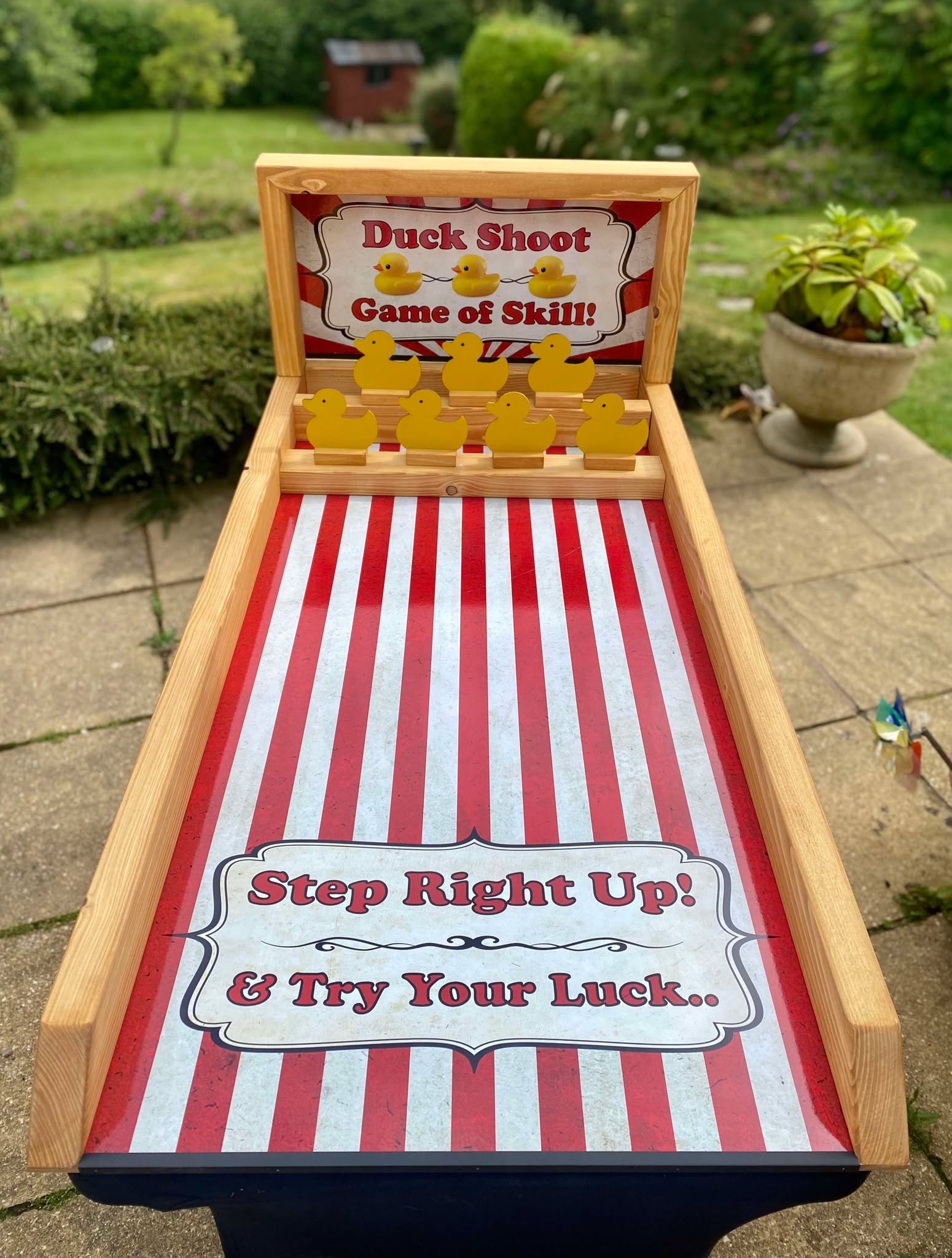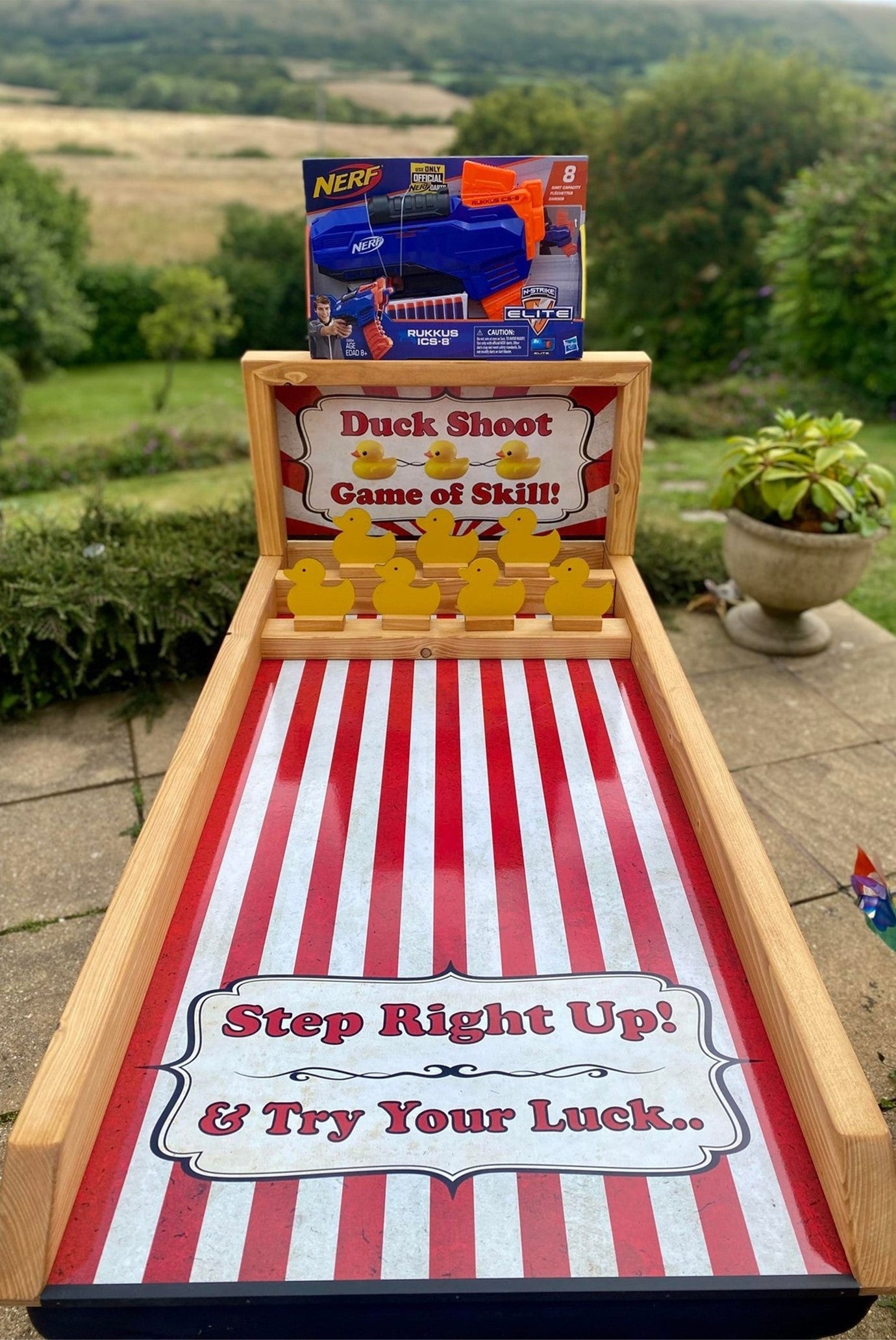 Duck Shoot is a traditional and popular handmade wooden tabletop game to test your skill with a safe foam bullet Nerf gun. How many ducks can you knock down? This amazing game is 4ft long by 2ft wide and will sit securely on almost any table. The wooden header is 2ft wide by 1ft tall and simply attaches using 2 steel dowels. It comes with all accessories ready to play including a great quality Nerf gun (design may vary). Available in the standard red striped retro graphics, included in the price or maybe add your company name/logo, website or have it fully branded in your company colours!