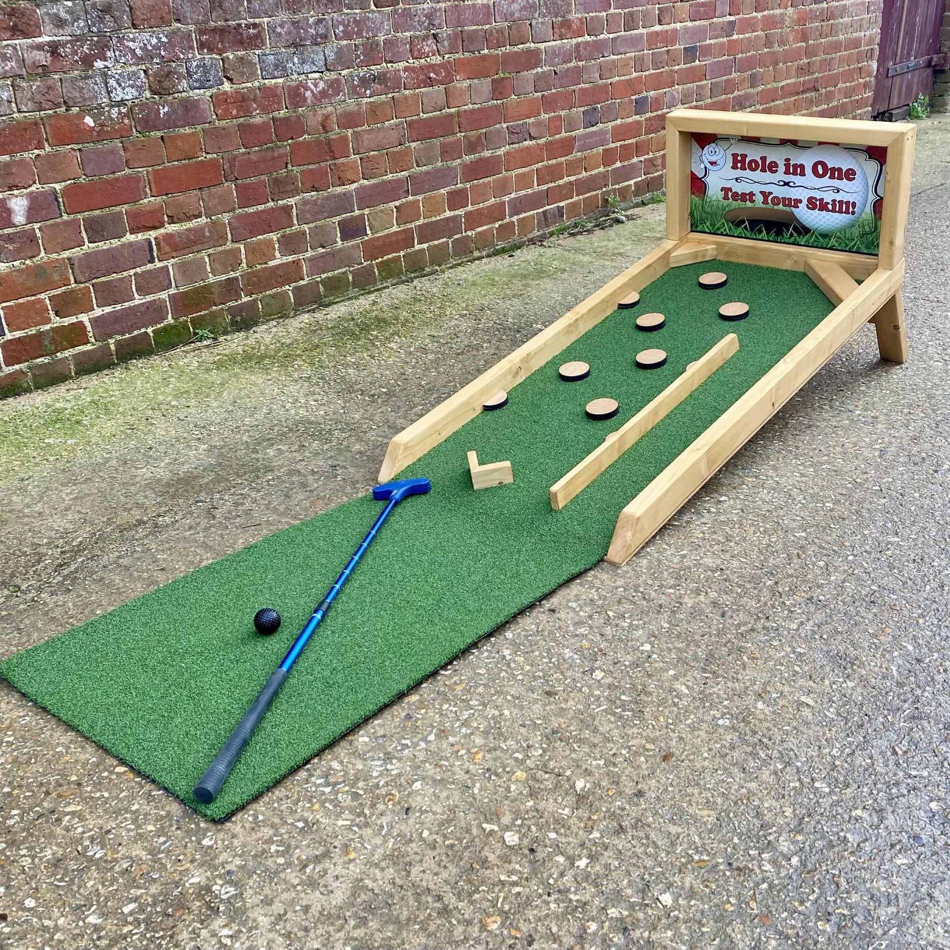 Hole in One - Design 2 is a fun handmade wooden freestanding floor game to test your golf and putting skills. Players try and get a hole in one using the professional adjustable putter and low bounce golf ball. The game has a hill climb and wooden obstacles to make life harder! The Hole in One uses the very best quality Pro Putt grass. This amazing game is 4ft long by 2ft wide and extends to around 6ft long and sits on the floor. The wooden header is 4ft wide by 1ft tall and simply attaches using 2 steel dowels. It comes with all accessories ready to play. Available in the standard red striped retro graphics, included in the price or maybe add your company name/logo, website or have it fully branded in your company colours!