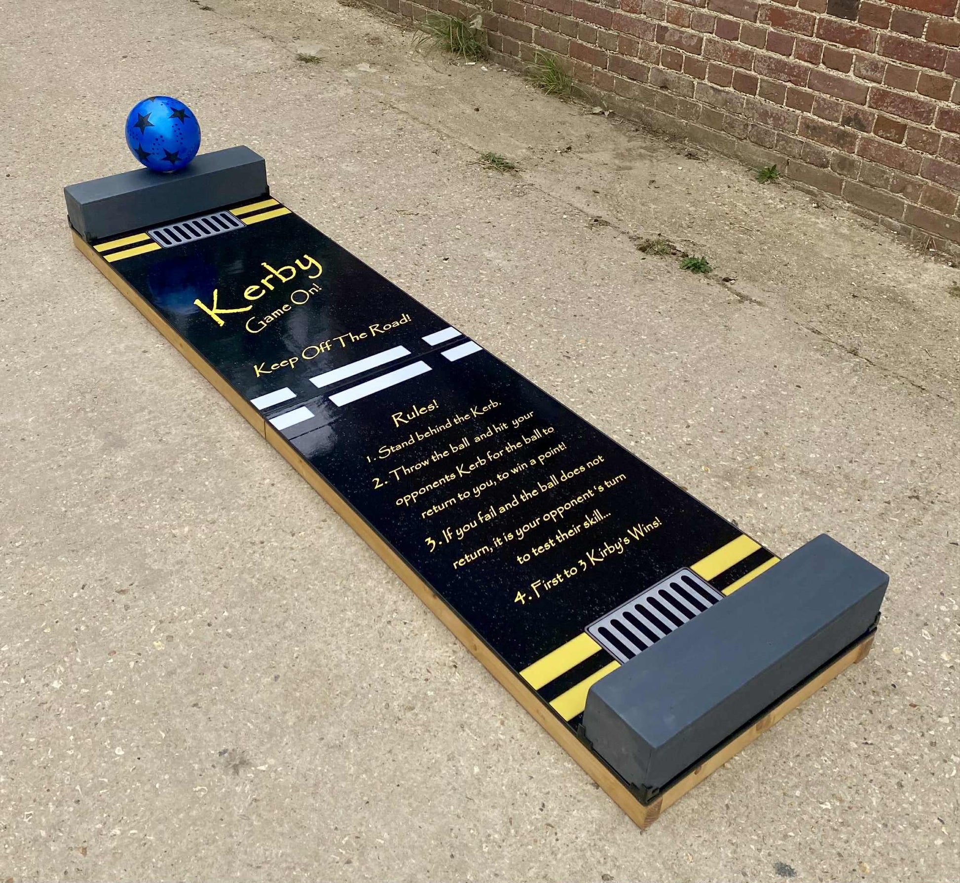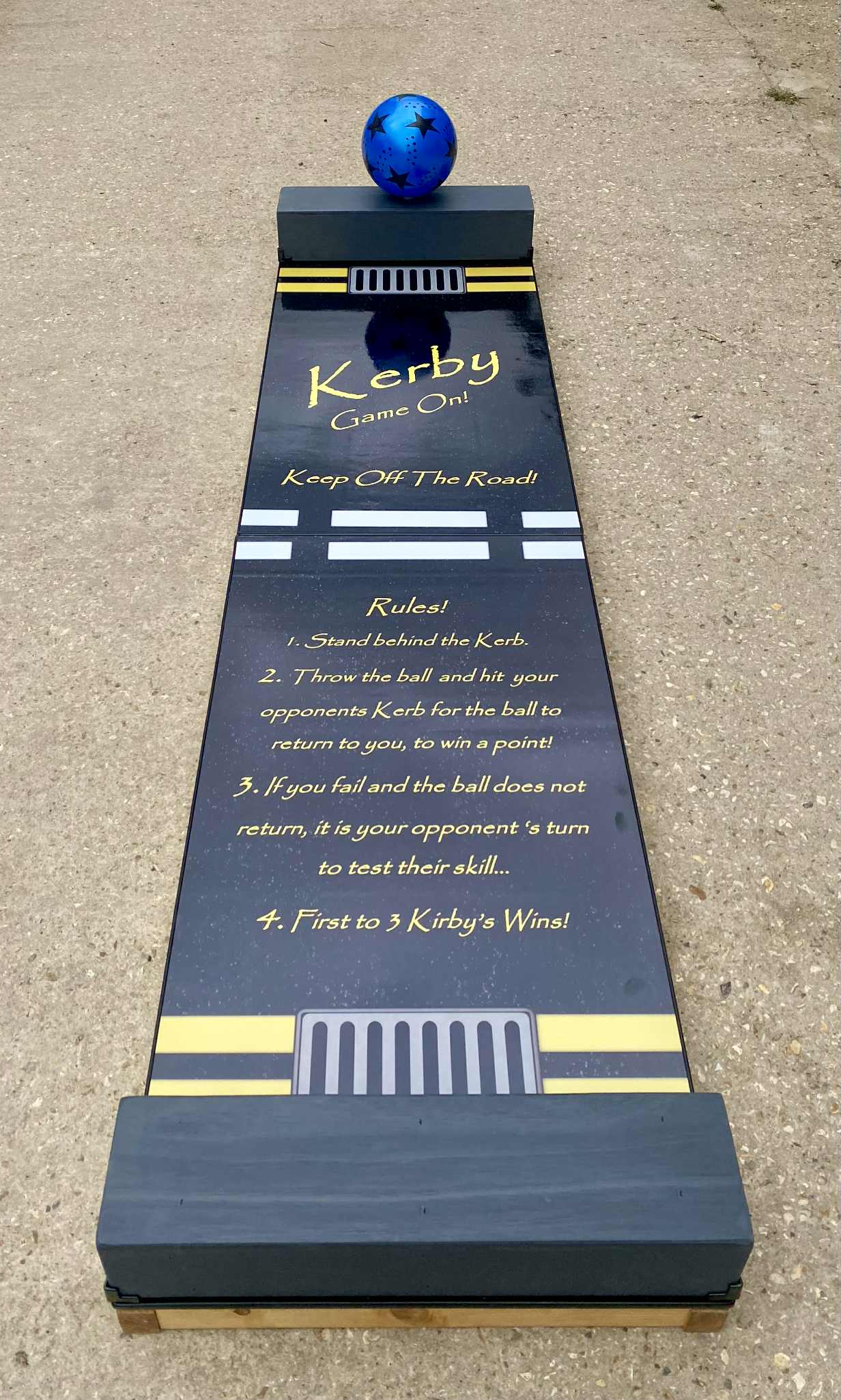 Introducing “Kerby”. A huge 8ft long handmade two player wooden game. This game was traditionally played either side of the road trying to bounce the ball off the kerb back to you to win a point. A fun and simple game before kids had mobile phones, computer games and internet! :-) Comes in 2 main sections that simply bolt together with wing nuts and will fit into our standard protective bag. A great game for the rental market, fetes, fairs and events.
