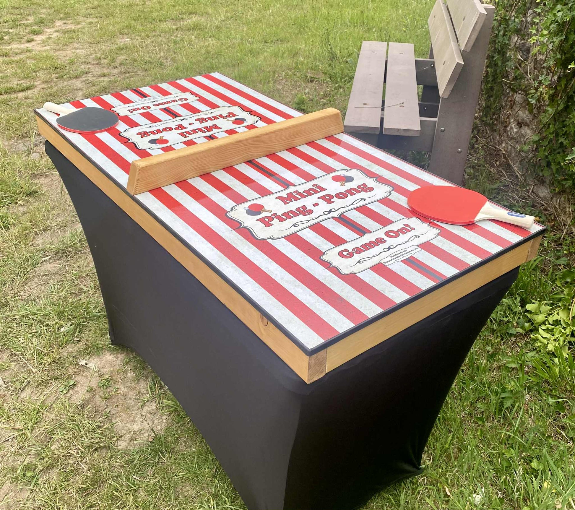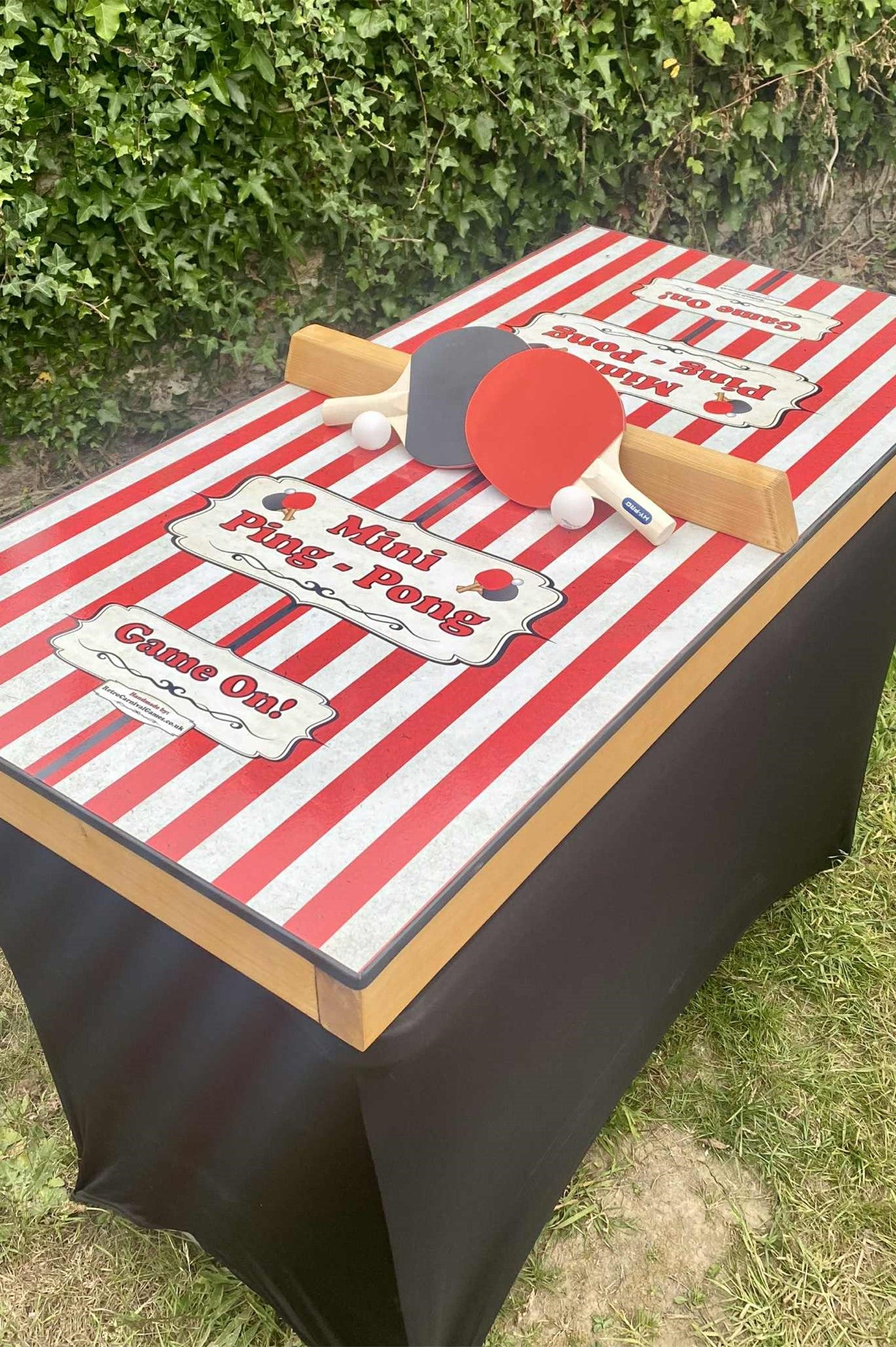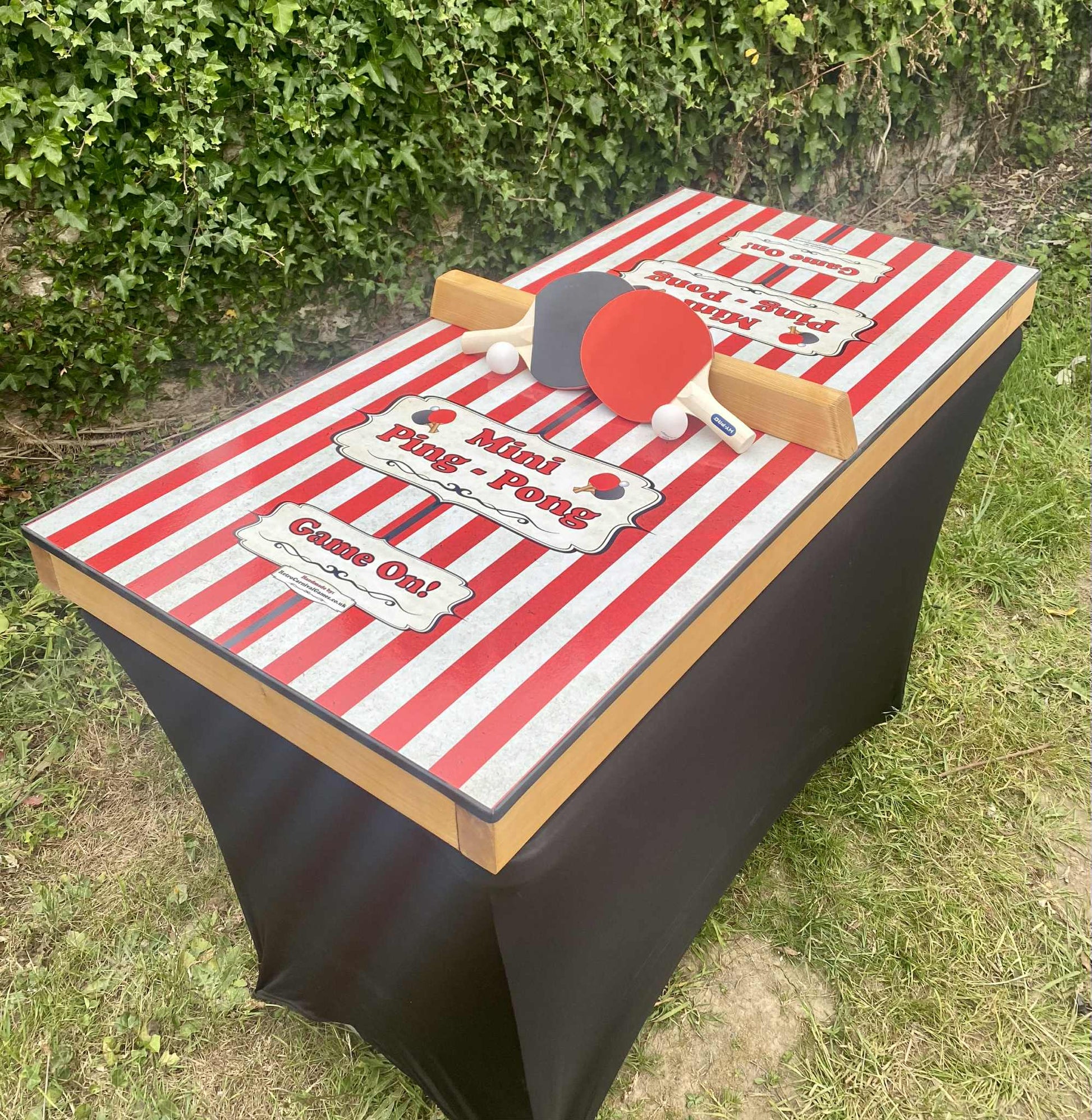 Mini Ping Pong is a traditional popular handmade wooden tabletop game to test your table tennis skill! A simple but very popular game, built like a tank so ideal for the rental market! This amazing game is 4ft long by 2ft wide and will sit securely on almost any table. It comes with all accessories ready to play. Available in the standard red striped retro graphics, included in the price or maybe add your company name/logo, website or have it fully branded in your company colours!