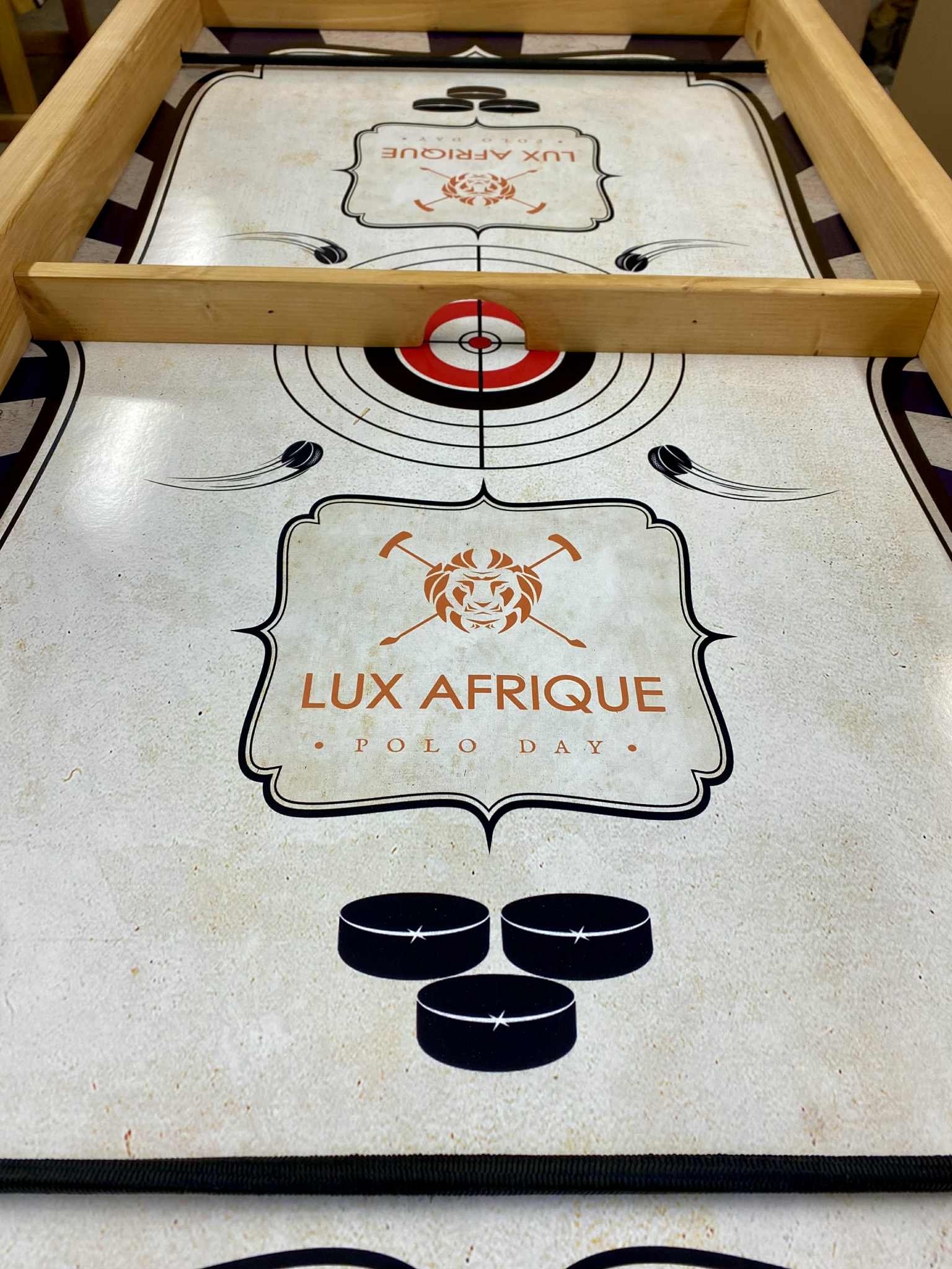 Puck Wars is a highly addictive, fast paced 2-player handmade wooden tabletop game to test your skill! Both players play simultaneously where you ping the wooden pucks through a small gap in the centre of the game board using bungee cord. The winner is the first player to clear their side. Fast and furious! This amazing game is 4ft long by 2ft wide and will sit securely on almost any table. It comes with all accessories ready to play. Available in the standard red striped retro graphics, included in the price or maybe add your company name/logo, website or have it fully branded in your company colours!