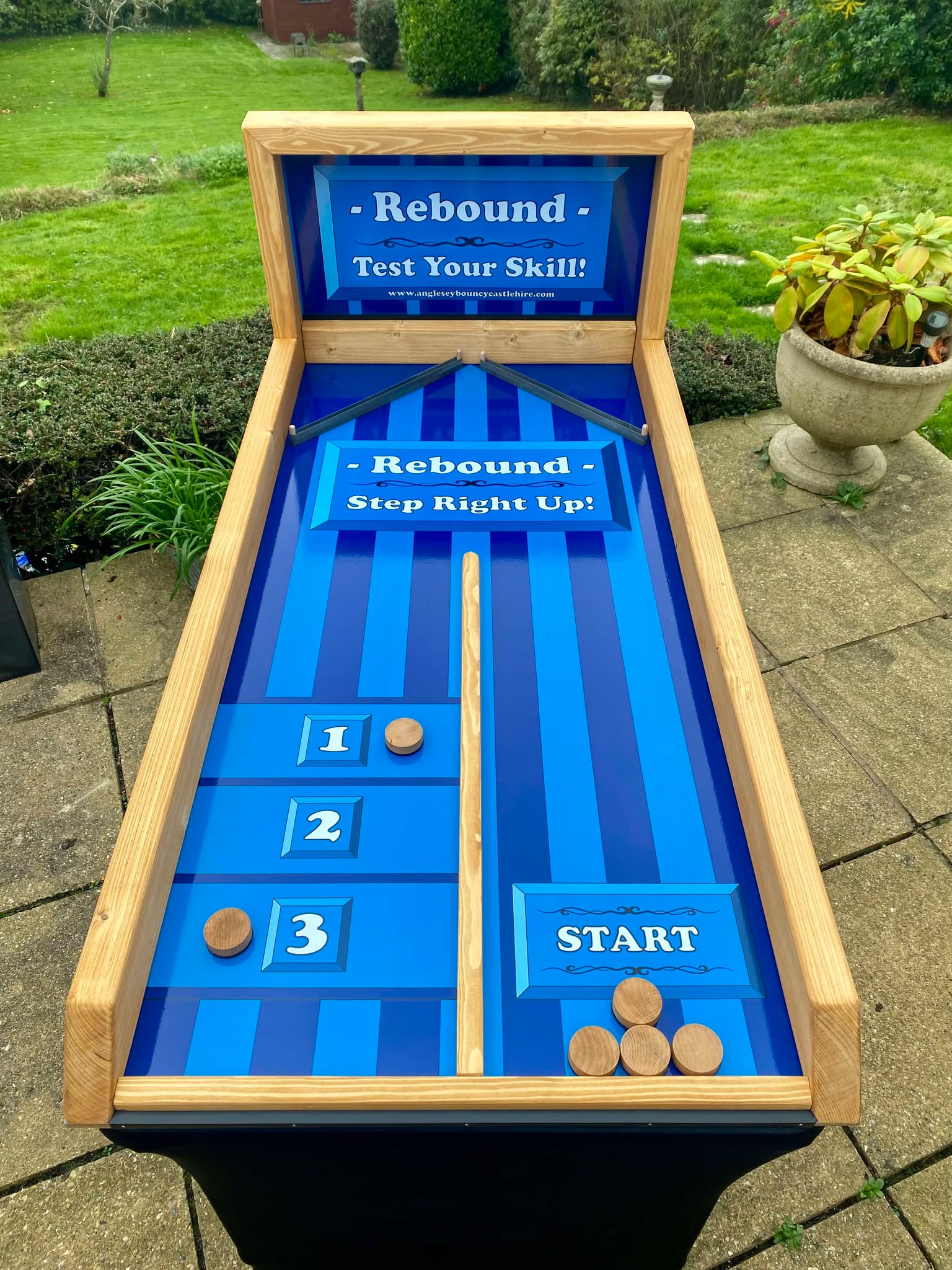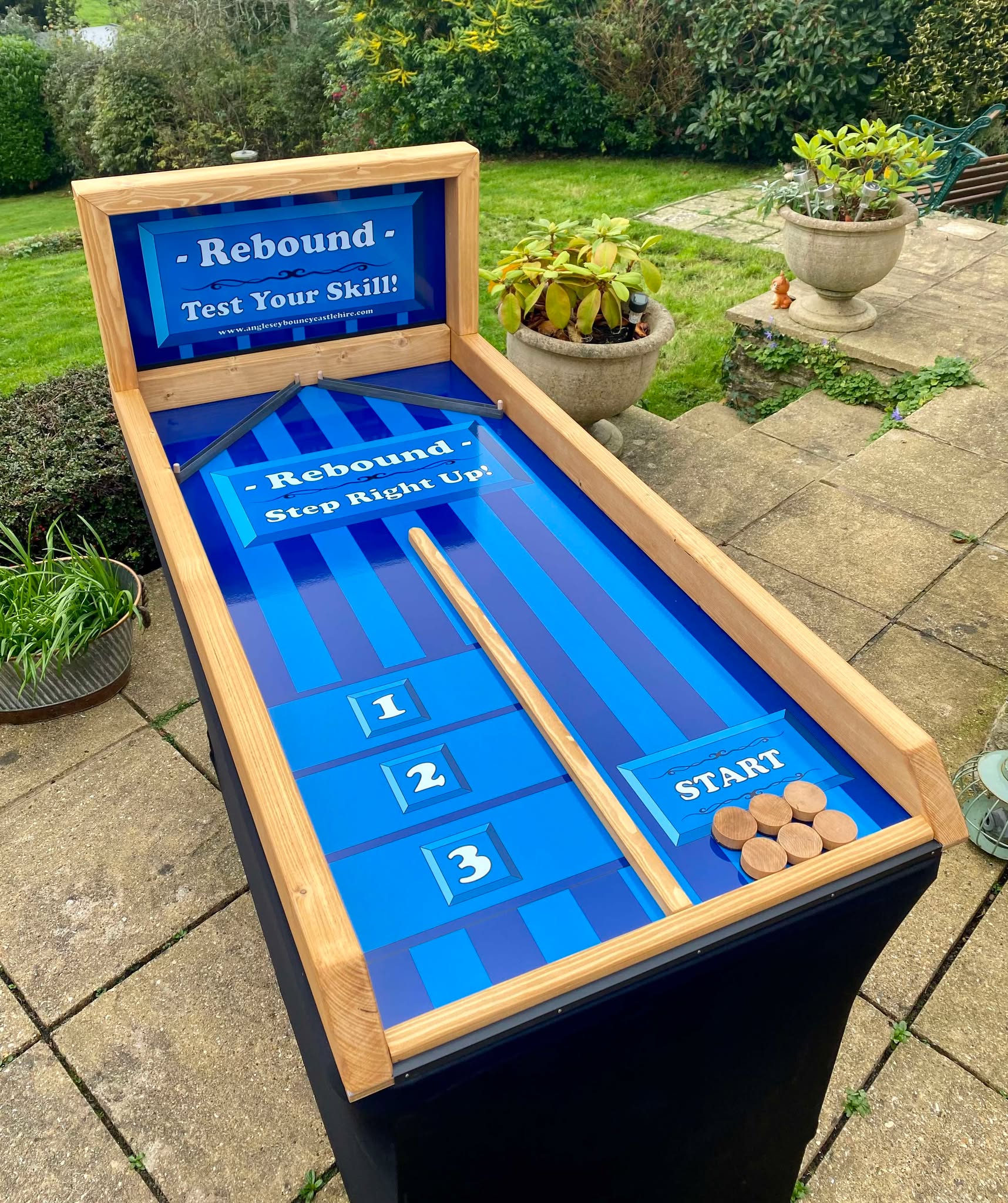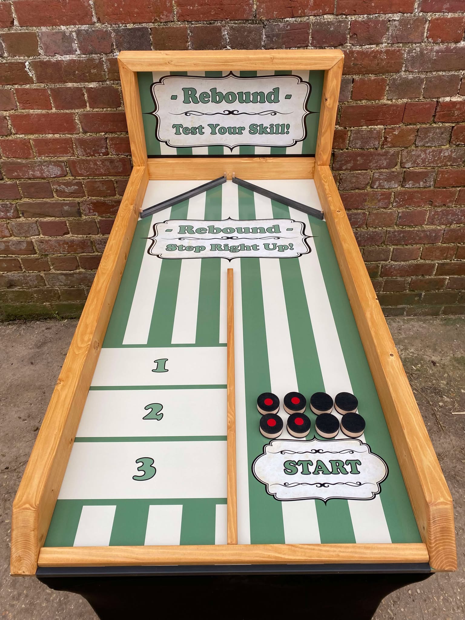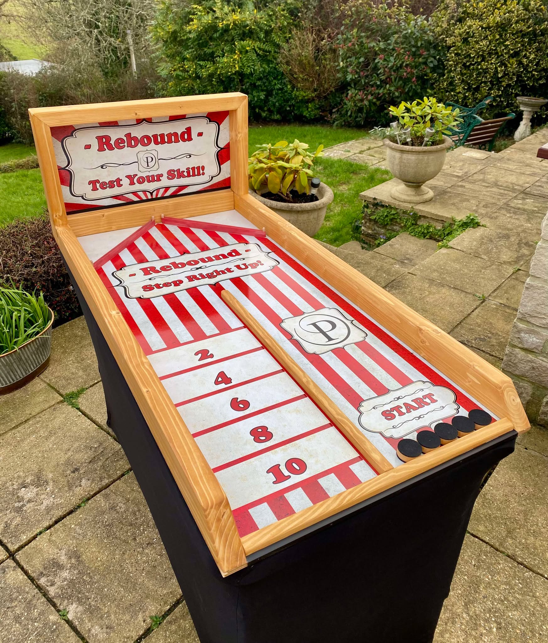 Rebound is an exciting handmade wooden tabletop game to test your skill with hand/eye co-ordination. Slide the wooden discs along the game board to rebound at the top and land in the scoring zone. This great game is 4ft long by 2ft wide and will sit securely on almost any table. The wooden header is 2ft wide by 1ft tall and simply attaches using 2 steel dowels. It comes with all accessories ready to play. Available in the standard red striped retro graphics, included in the price or maybe add your company name/logo, website or have it fully branded in your company colours!