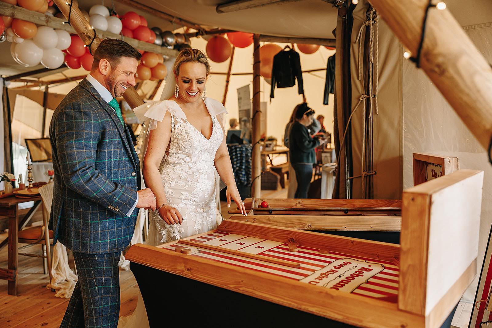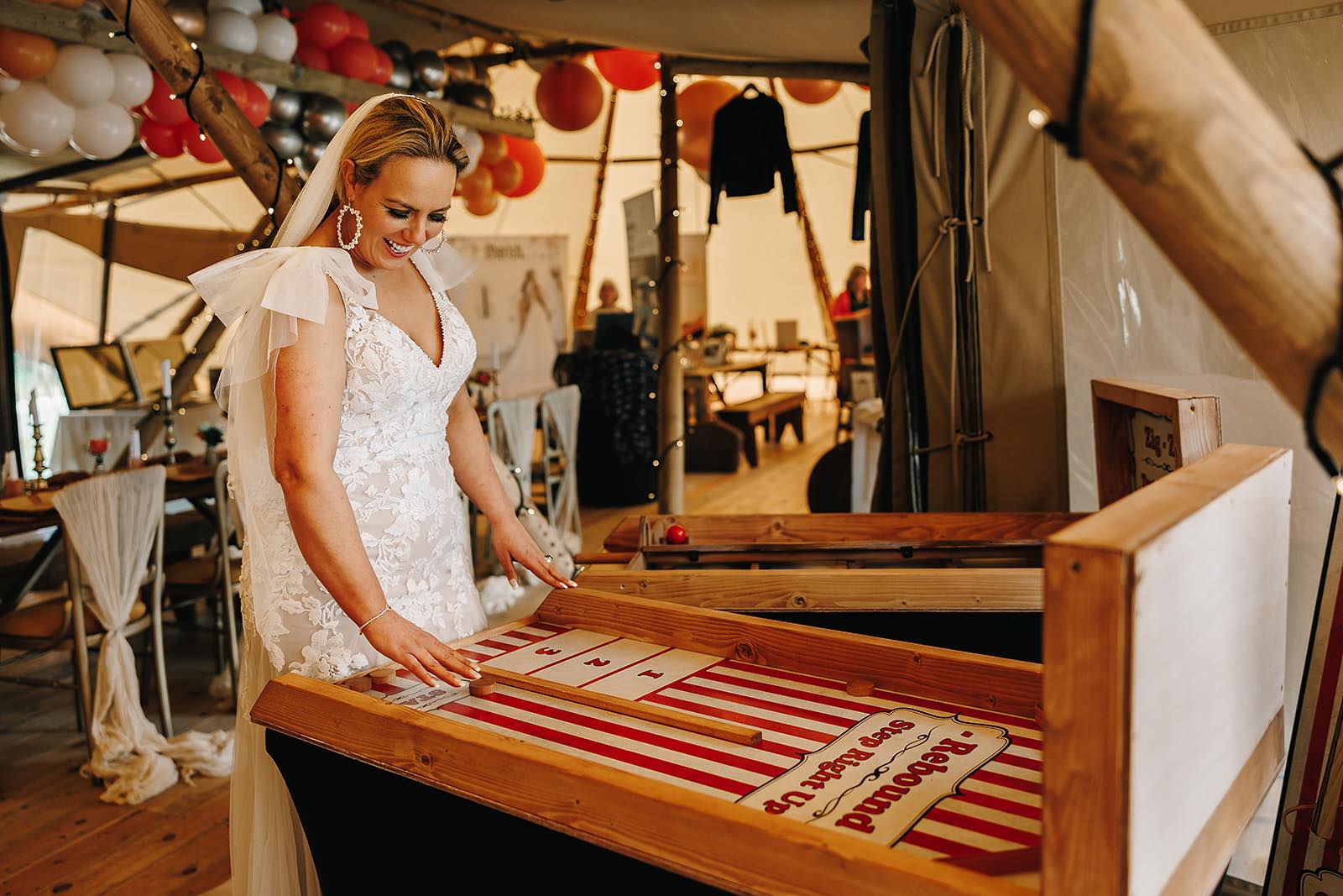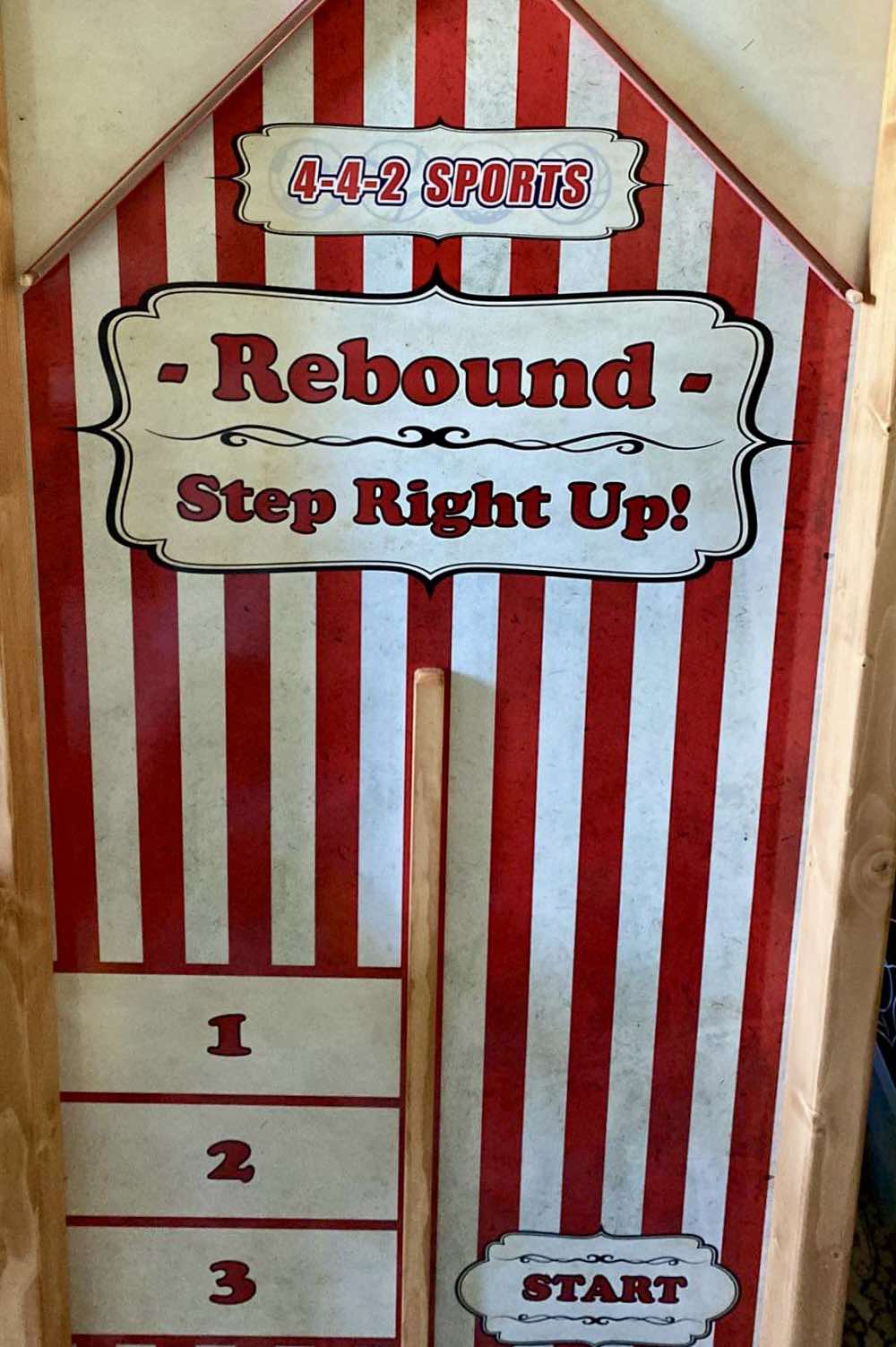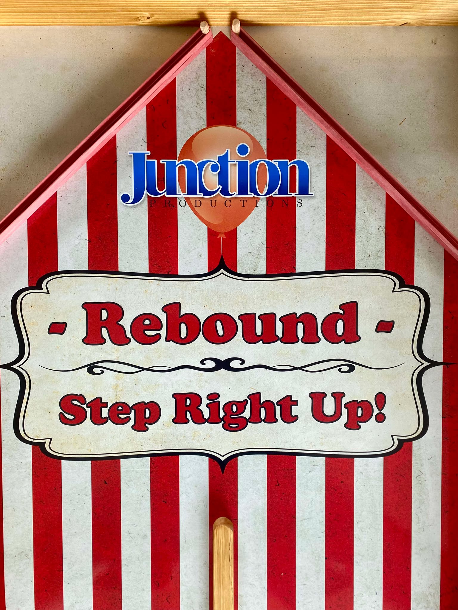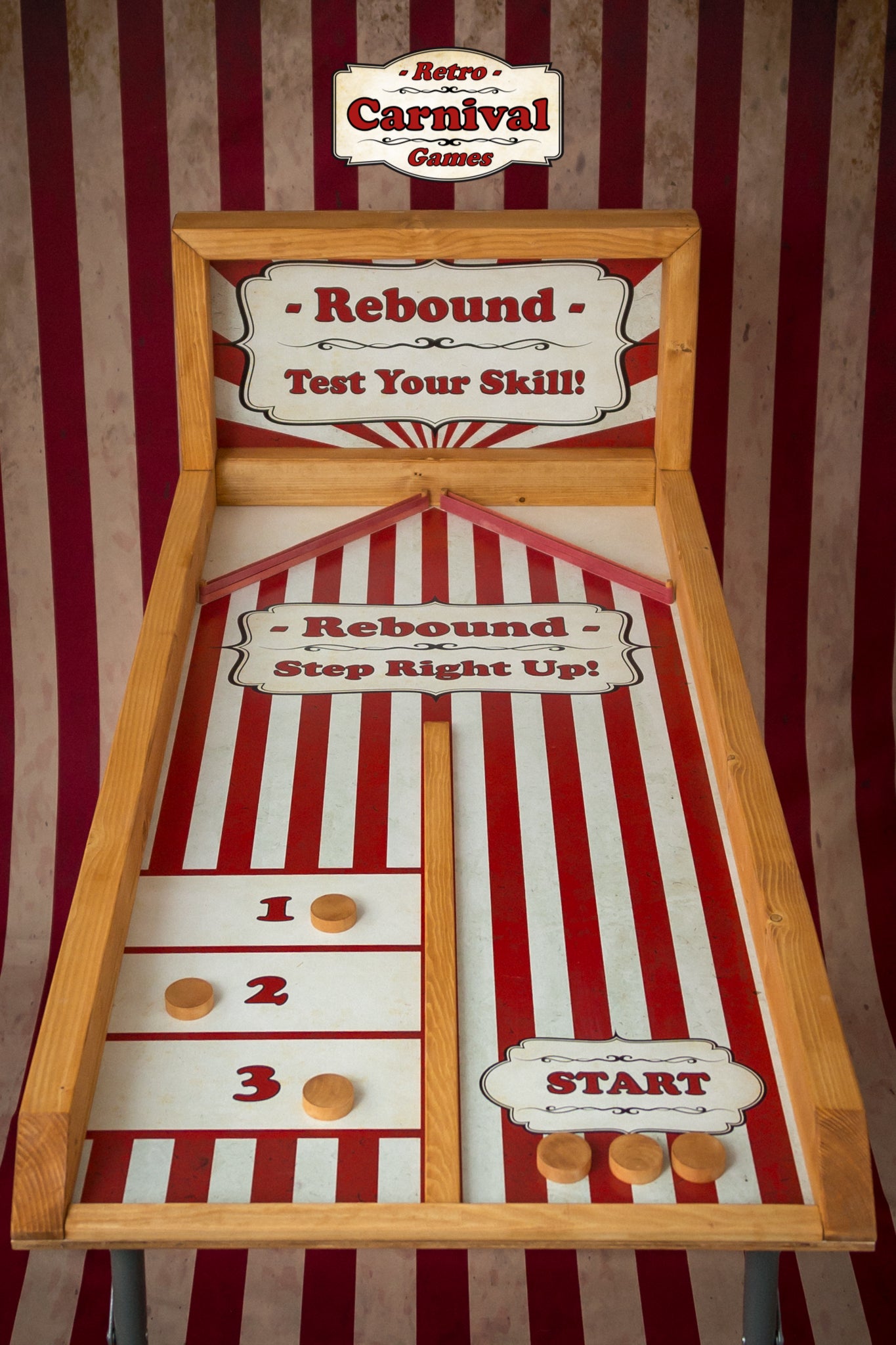 Rebound is an exciting handmade wooden tabletop game to test your skill with hand/eye co-ordination. Slide the wooden discs along the game board to rebound at the top and land in the scoring zone. This great game is 4ft long by 2ft wide and will sit securely on almost any table. The wooden header is 2ft wide by 1ft tall and simply attaches using 2 steel dowels. It comes with all accessories ready to play. Available in the standard red striped retro graphics, included in the price or maybe add your company name/logo, website or have it fully branded in your company colours!