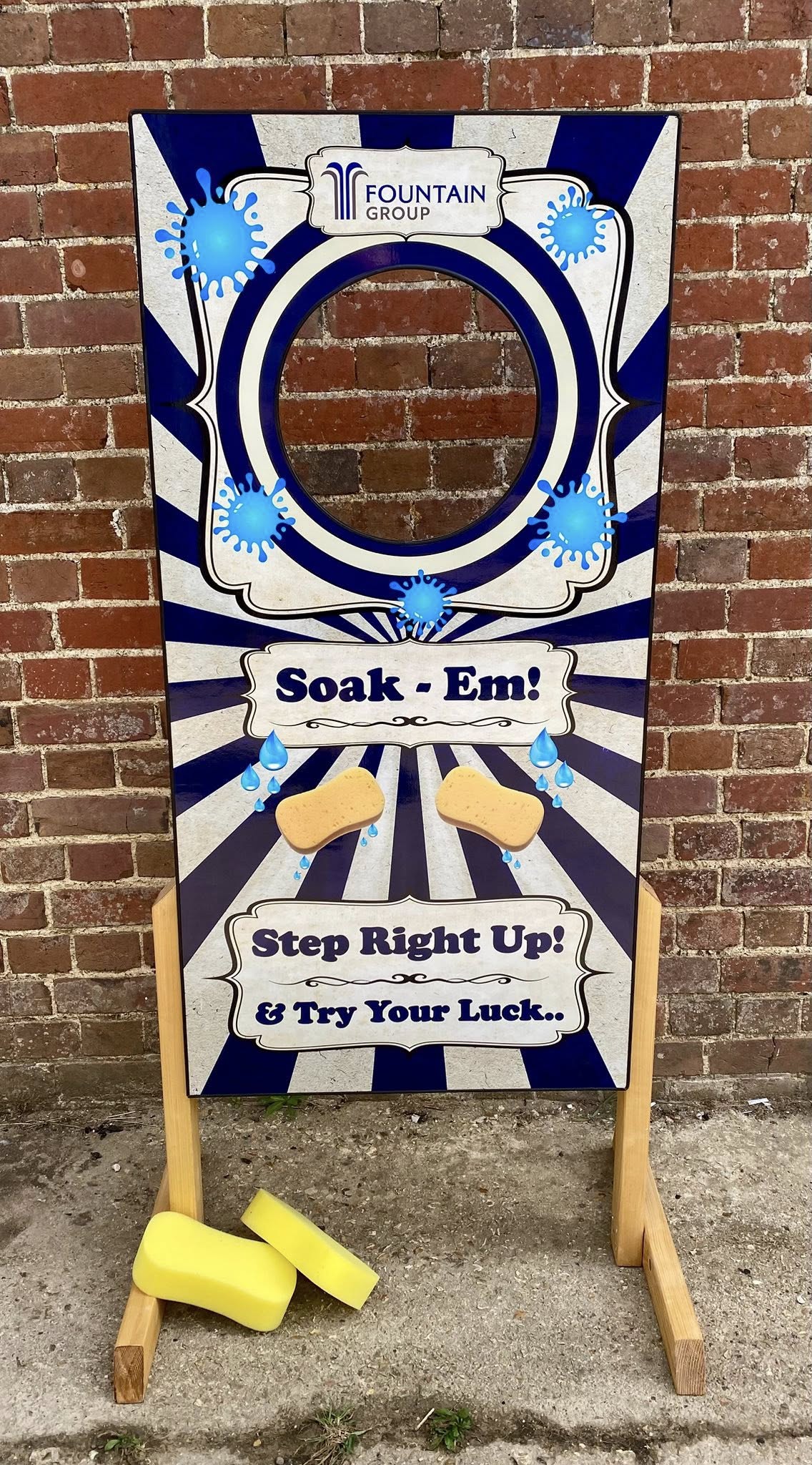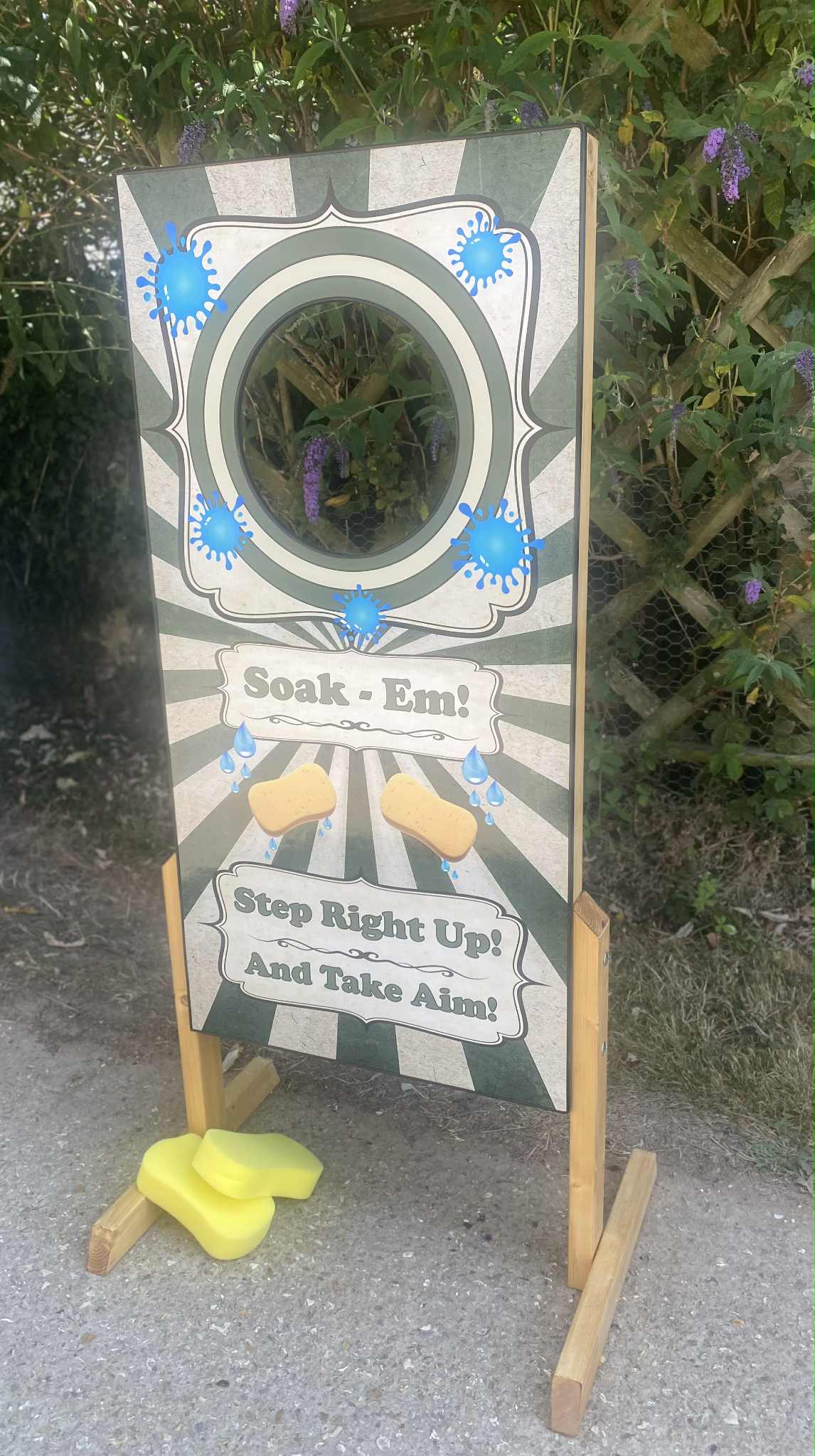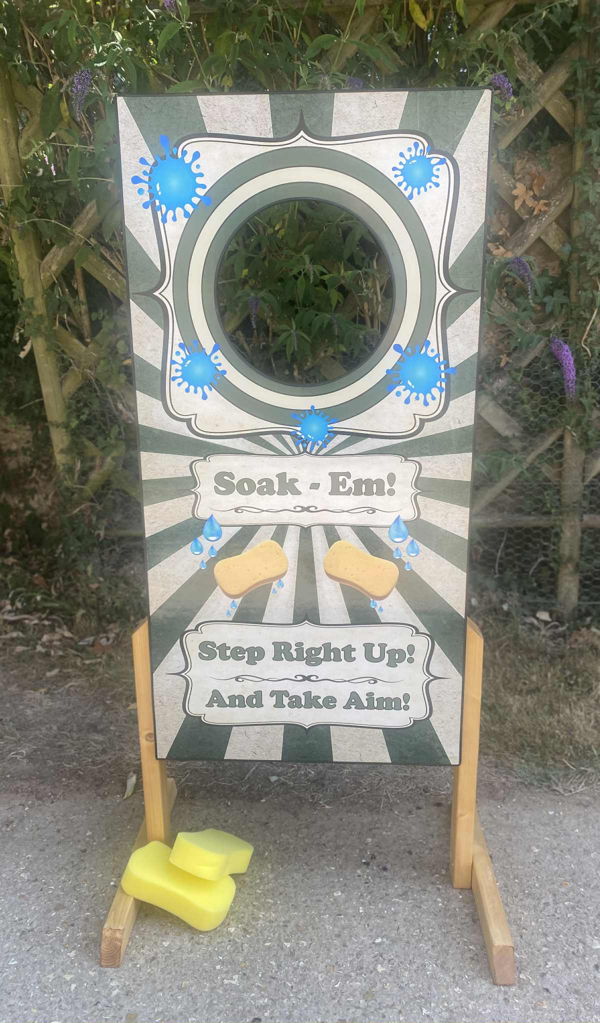 Standing around 5ft tall, an unfortunate person is selected to stand behind the Soak Em game and players pay to toss wet sponges at them! Sponges supplied, just add a bucket of water and you are good to go!